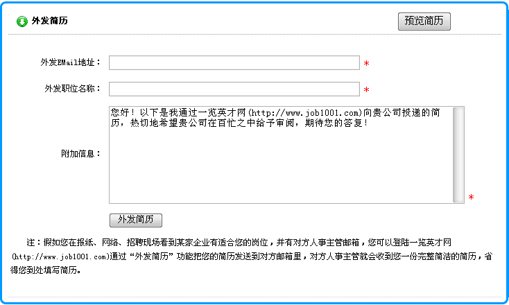 2) 在打開的頁面中,輸入接收企業(yè)的Email地址、應(yīng)聘的職位名稱以及您的其它要求后,點(diǎn)擊"發(fā)送簡(jiǎn)歷"按鈕就可以了。如下圖所示:
